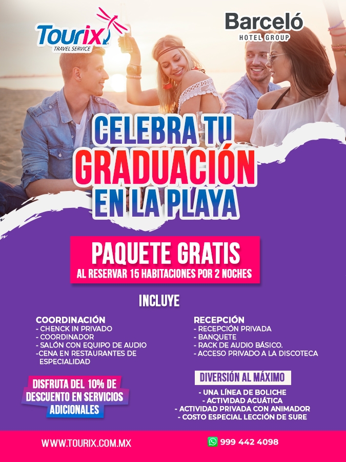 Barceló Maya Grand Resort es un complejo turístico, que se caracteriza por sus playas de arena blanca, en forma de media luna, con algunos afloramientos rocosos, en los que el agua dulce fluye, el complejo ideal tener un perfecto adiós de una etapa tan importante como lo es su graduación. Formado por los cinco hoteles más bellos de Riviera Maya Barceló Maya Beach, Barceló Maya Colonial, Barceló Maya Caribe, Barceló Maya Palace y Barceló Maya Tropical, al hospedarte en uno podrás disfrutar de los servicios e instalaciones de los 5 hoteles, que incluyen Playa, piscinas por todo el resort, restaurantes y bares 24 horas, discotecas, club nocturno, delfinario, club de niños, teatro, discoteca e incluso un centro comercial.